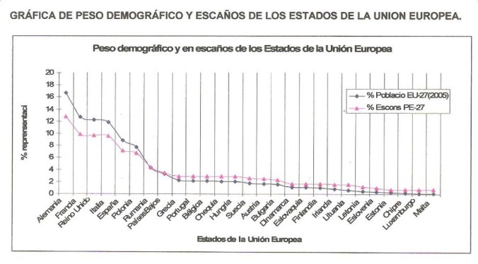 En el cuadro anterior se comprueba que el índice de representatividad, en escaños en el PE y la serie de la curva de población (columna segregada a la derecha), toma valores muy dispares pudiéndose establecer tres grupos de estados.