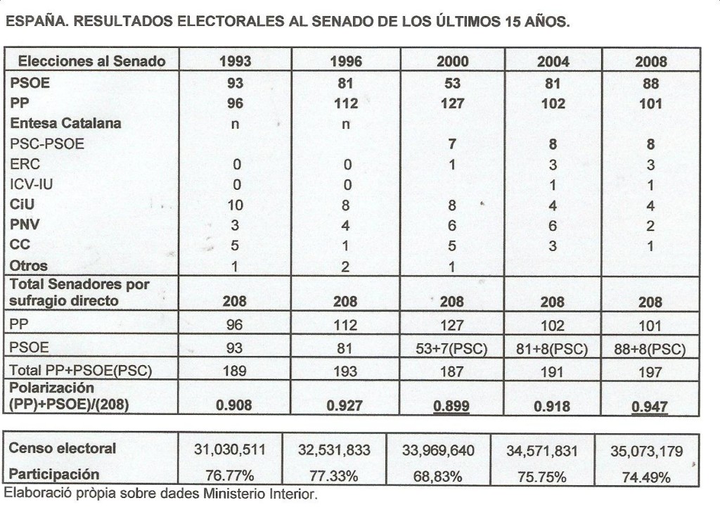 El primer cuadro, referido al Senado, muestra los resultados de las cinco últimas convocatorias electorales y el índice de polarización. En el anexo 2, se incluyen los resultados por Comunidades Autónomas con los correspondientes índices de polarización.