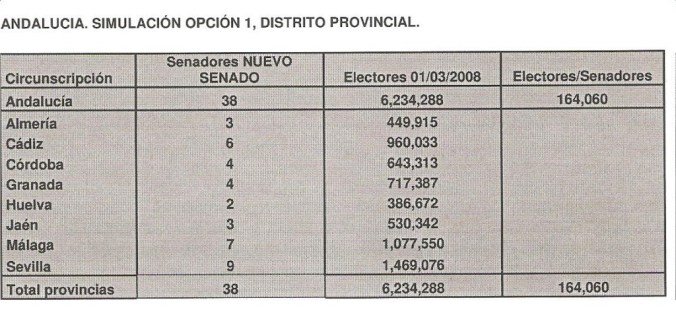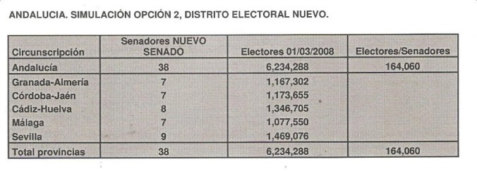 La operatividad de la circunscripción autonómica exigiría establecer distritos electorales, las verdaderas circunscripciones electorales, más pequeñas calculadas sobre la base de una cierta homogeneidad de electores por Senador a elegir. Así, si a una comunidad, por ejemplo Andalucía, corresponde 38 Senadores para un cuerpo electoral de 6.234.288, la relación de electores por Senador es de 164.060 (6.234.288/38), por lo que en toda la Comunidad habría de respetarse, dentro de unos márgenes de operatividad, ese cociente. Entonces, manteniendo esa filosofía de representatividad, y en función de la operatividad electoral los distritos electorales se establecerían de forma conveniente, en ocasiones reasumiendo circunscripciones provinciales o conformando nuevos distritos, de manera que se mantuviera la homogeneidad de la relación electores por Senador, como si, efectivamente, la circunscripción electoral fuera autonómica y única.