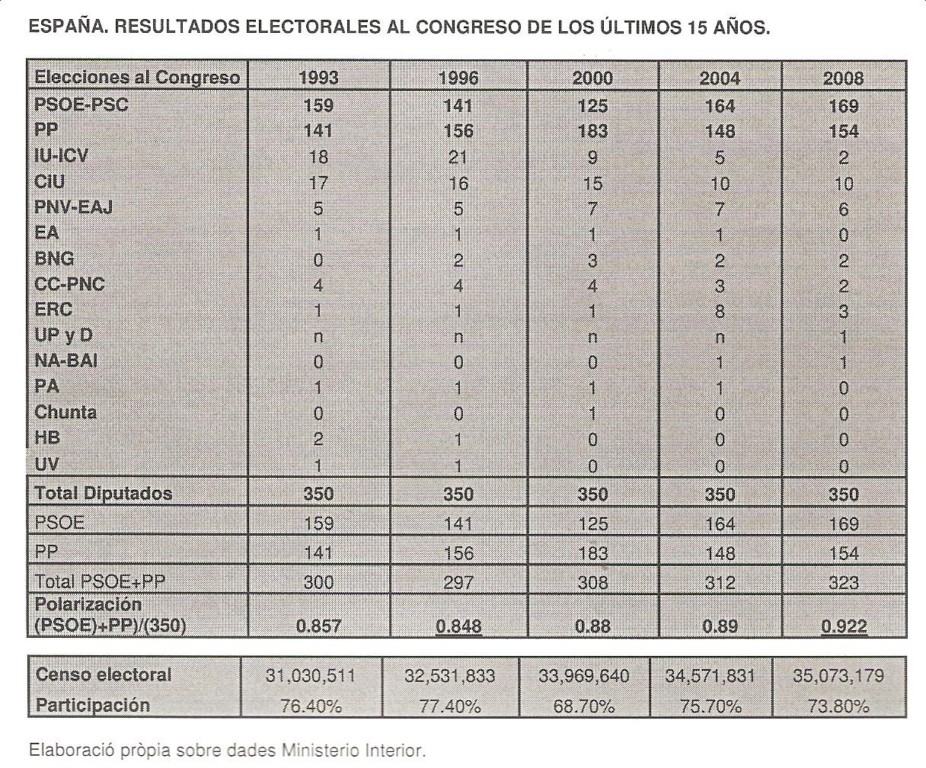 Del análisis sucinto de los resultados electorales, según el procedimiento actual o las simulaciones con circunscripción autonómica o provincial ponderada a nivel nacional, puede observarse que la polarización en torno a los partidos mayoritarios sigue produciéndose, en valores similares por lo que respecta a la suma de los partidos hegemónicos nacionales, sin embargo, estos índices pueden variar sensiblemente según se trate de una u otra simulación, véase el cuadro que sigue.
