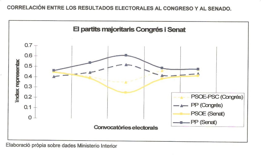 La gráfica que sigue relaciona los índices de representación de los dos partidos, PP y PSOE, en el Congreso y en el Senado, en las últimas cinco convocatorias electorales, donde se visualiza la alta correlación entre las dos Cámaras, y cómo las mayorías del PP y del PSOE, se obtienen de forma contraria en el Congreso, para el PSOE y en el Senado, para el PP.