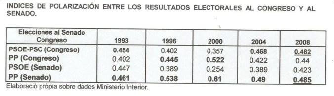 En el cuadro siguiente se cuantifica el gráfico anterior. El partido mayoritario en el Congreso, el PSOE, obtiene un índice de 0.482, por 0.44 del PP. Por lo que respecta al Senado, es el PP con 0.485, quien es mayoritario por, solo, 0.423 del PSOE. La tónica habitual es, pues, de sentido contrario de polarización entre los dos partidos según se refiera al Congreso o al Senado.