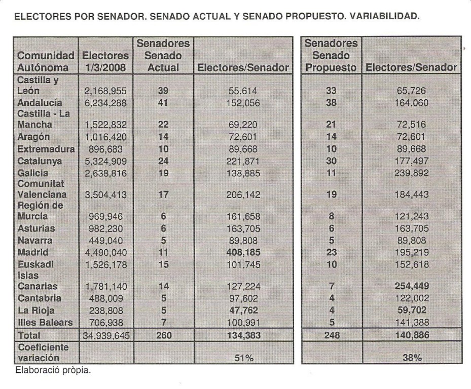 El cuadro siguiente refleja la realidad representativa del Senado actual y la del Senado que se propone. Como es visible la media de electores por Senador es superior en el nuevo Senado que en el actual (134.383). Como, también si se considera la población representada, en el Senado actual media de población/Senador es de 173.287, mientras que en el Senado de la propuesta asciende a 181.672, sin embargo, la nueva situación sería más favorable porque, como se recordará, el coeficiente de variación, (la variabilidad) sobre datos de número de población, es del 71%, en tanto, para el Senado propuesto sería del 39% (Cap.5, Apdo. 4) Y, sobre datos de número de electores, en el Senado actual es del 51% y del 38% en el caso del Senado propuesto.