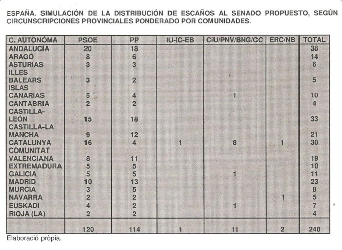 En el cuadro siguiente, se realiza la misma simulación según circunscripciones provinciales pero ponderadas para la relación electores/Senadores sea la misma, o similar, en cada una de las Comunidades. En el anexo 3, se desarrolla las simulaciones por Comunidades Autónomas.