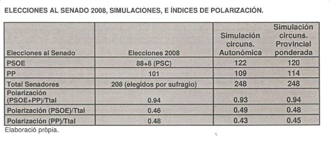 La distribución de escaños de las simulaciones no cambia la polarización actual de 0.94, (tomando como total los 208 Senadores elegidos por sufragio directo), o 0.93 si se incluye los 260 Senadores. (No se incluyen los de Ceuta y Melilla) Así pues, sea una u otra la simulación que se considere, circunscripción autonómica o provincial ponderada, persiste la misma polarización 0.93 y 0.94. Y, por lo que se refiere a los dos partidos hegemónicos, hoy, sumando los Senadores electos y de designación autonómica, tiene una polarización de 0.47 el PSOE y 0.46 el PP. En la propuesta de nueva composición del Senado, el PSOE estaría en 0.49 por 0.43 del PP, en el supuesto de circunscripción autonómica, o en 0.48 el PSOE y 0.45 el PP, en el según supuesto de circunscripción provincial ponderada.