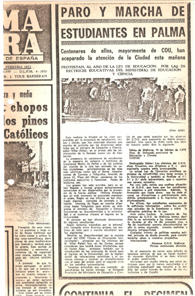 1972) La vaga de 1972. Per acabar, la crònica de Última Hora, de la vaga o manifestació que varem montar entre els cursos de Filosofia i Lletres, de l’Estudi General Lul.lià i l’Institut Ramon Llull. Era a COU, el curs 1971-1972
