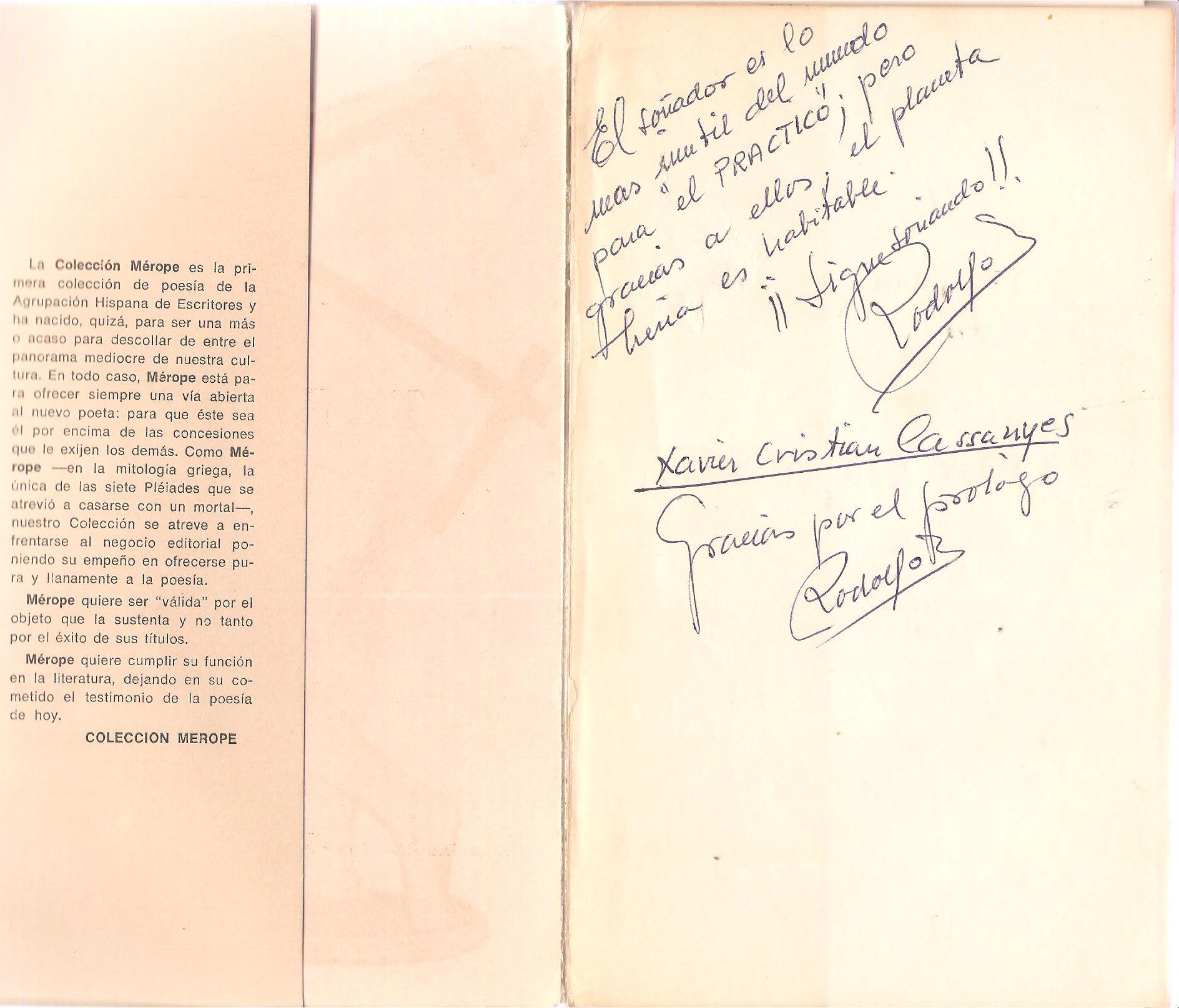 Más tarde, ya a finales de año creamos la colección Mérope de poesía. Como muchos iniciativas de ese tipo, en aquella época, no pasó del primer libro. Como editor, presenté la colección.